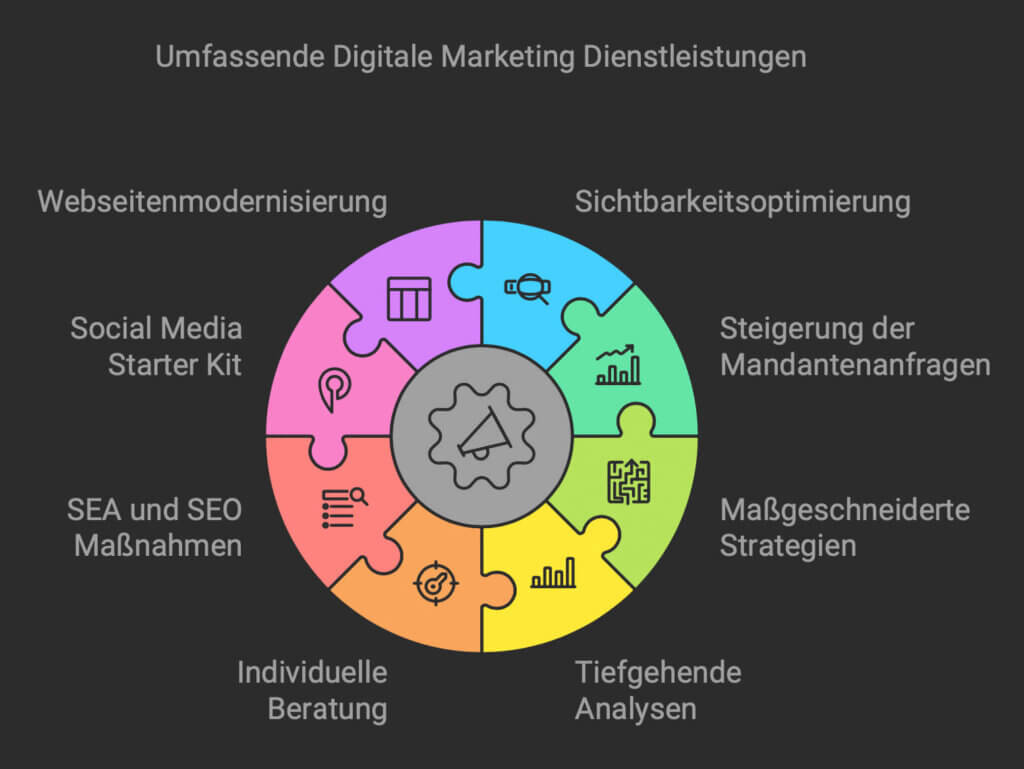 Unsere Leistungen umfassen nicht nur die Optimierung Ihrer Sichtbarkeit, sondern auch die Steigerung Ihrer Mandantenanfragen. Sie erhalten von uns eine maßgeschneiderte Strategie, die genau auf Ihre Bedürfnisse und Fachgebiete abgestimmt ist. Unsere Analysen sind tiefgehend und präzise, sodass Sie stets den Überblick über die Ergebnisse Ihrer Kampagnen behalten.